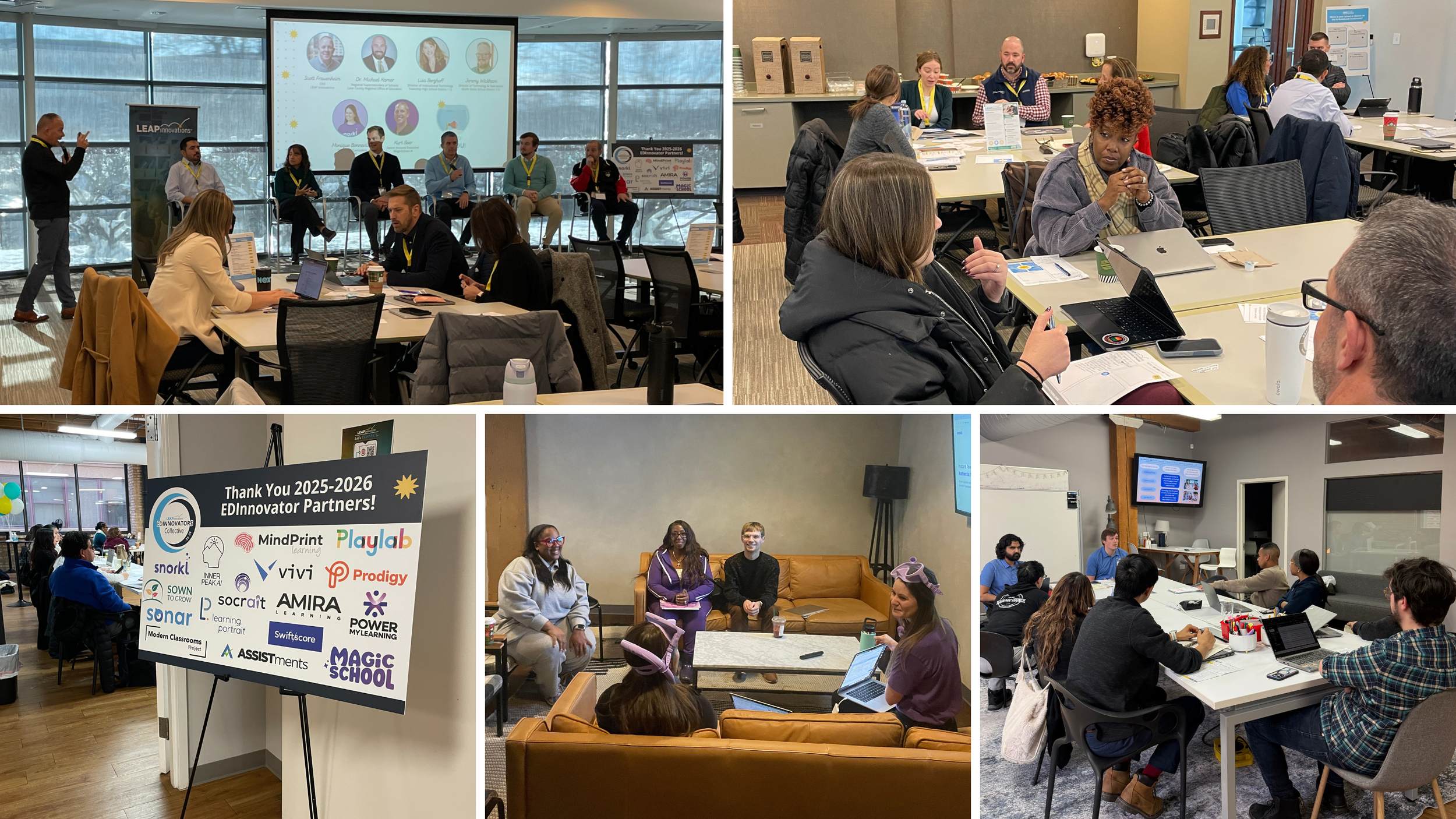 Pictured above (top row): LEAP partnered with the Lake County ROE to host an AI Symposium on December 5. The event brought together school and district leaders, educators, practitioners, and members of the EDInnovators Collective. Attendees engaged in Innovation Spotlights and panel discussions, exploring how AI is shaping equitable, innovative, and student-centered learning through local case studies, district-led integration efforts, and conversations about the opportunities and challenges of AI-powered teaching and learning in Lake County, Illinois.