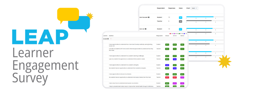 The LEAP Learner Engagement Survey asks teachers about their practices and students about their classroom experiences, providing valid and reliable insights into learner engagement, student-teacher relationships, and how students experience agency, ownership, and belonging. The survey may be eligible for funding with Title 1, Title IV, private foundation and other funds.